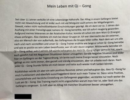 In cooperation with a correctional institution (JVA) a weekly Qi Gong training is offered for inmates.
